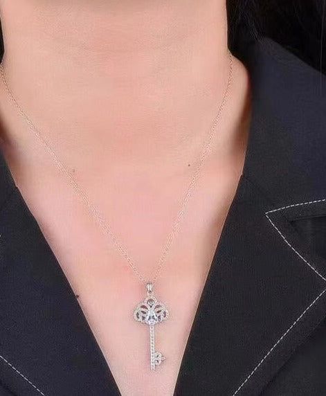 Unlock elegant style with the Moissanite Key Pendant Necklace. This unique necklace features a stunning key-shaped pendant made of Moissanite, a rare gemstone prized for its brilliance and durability. Add a touch of whimsy to any outfit with this playful necklace.